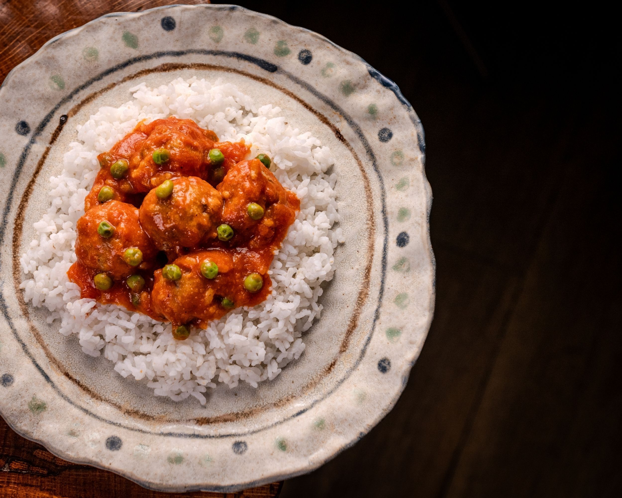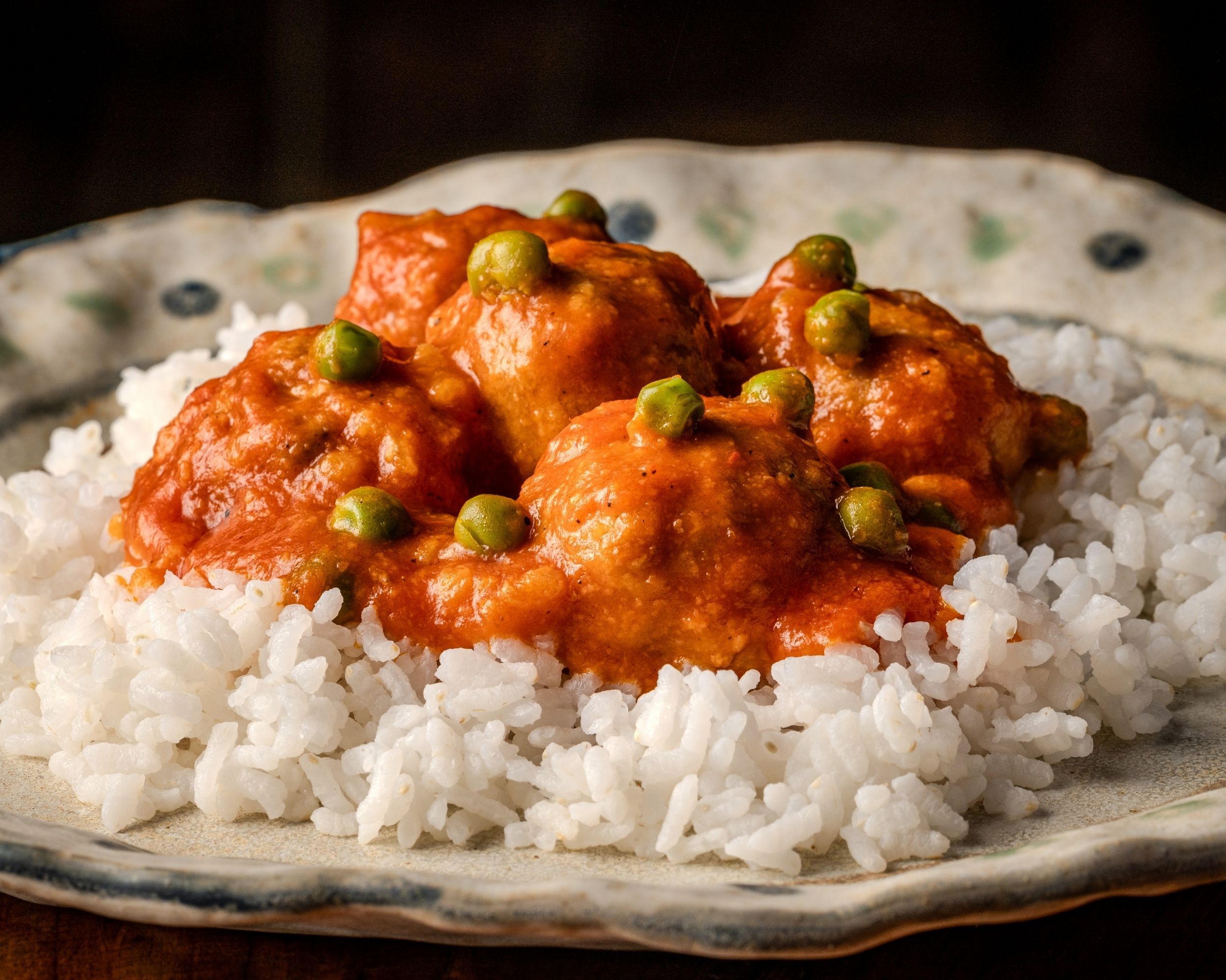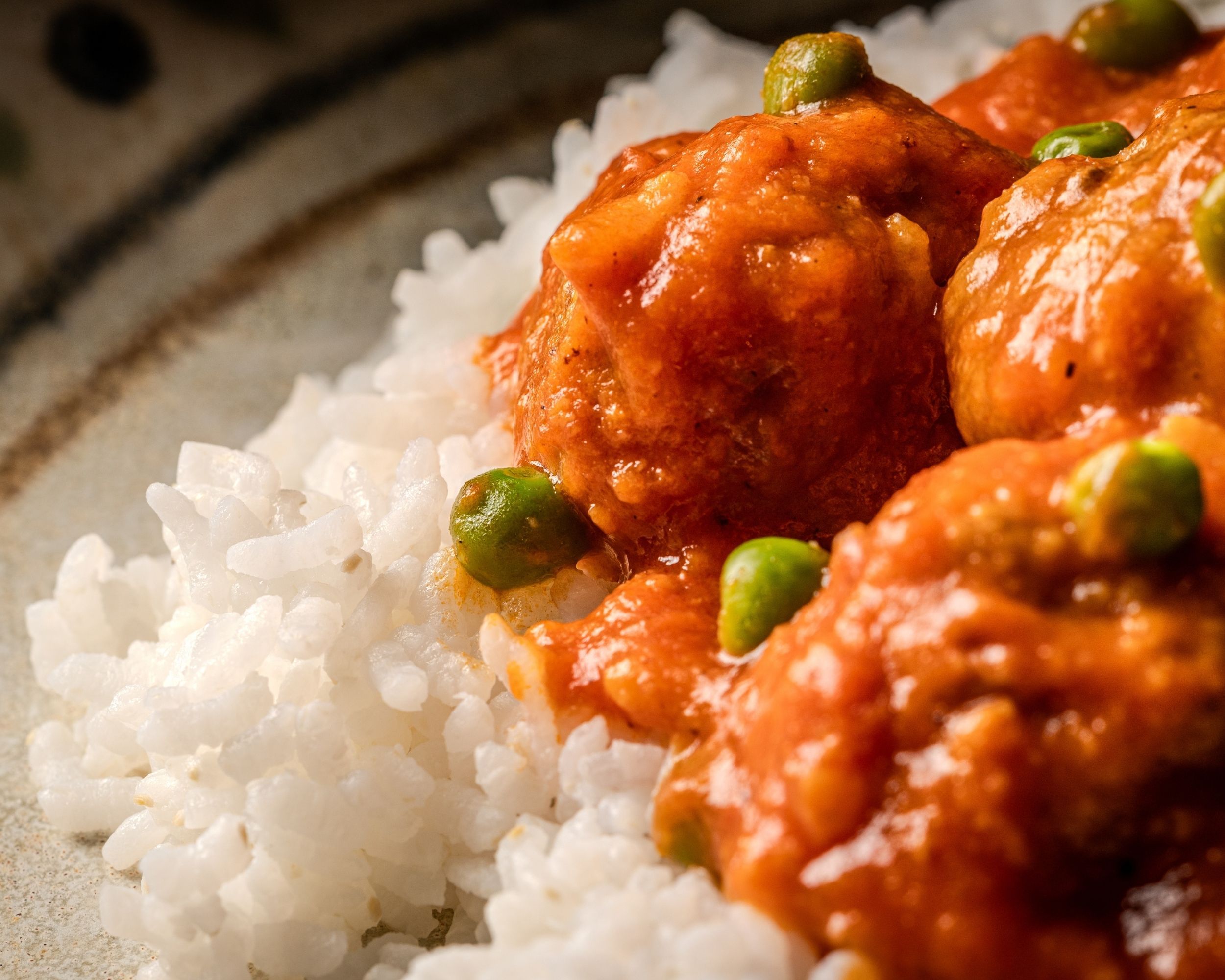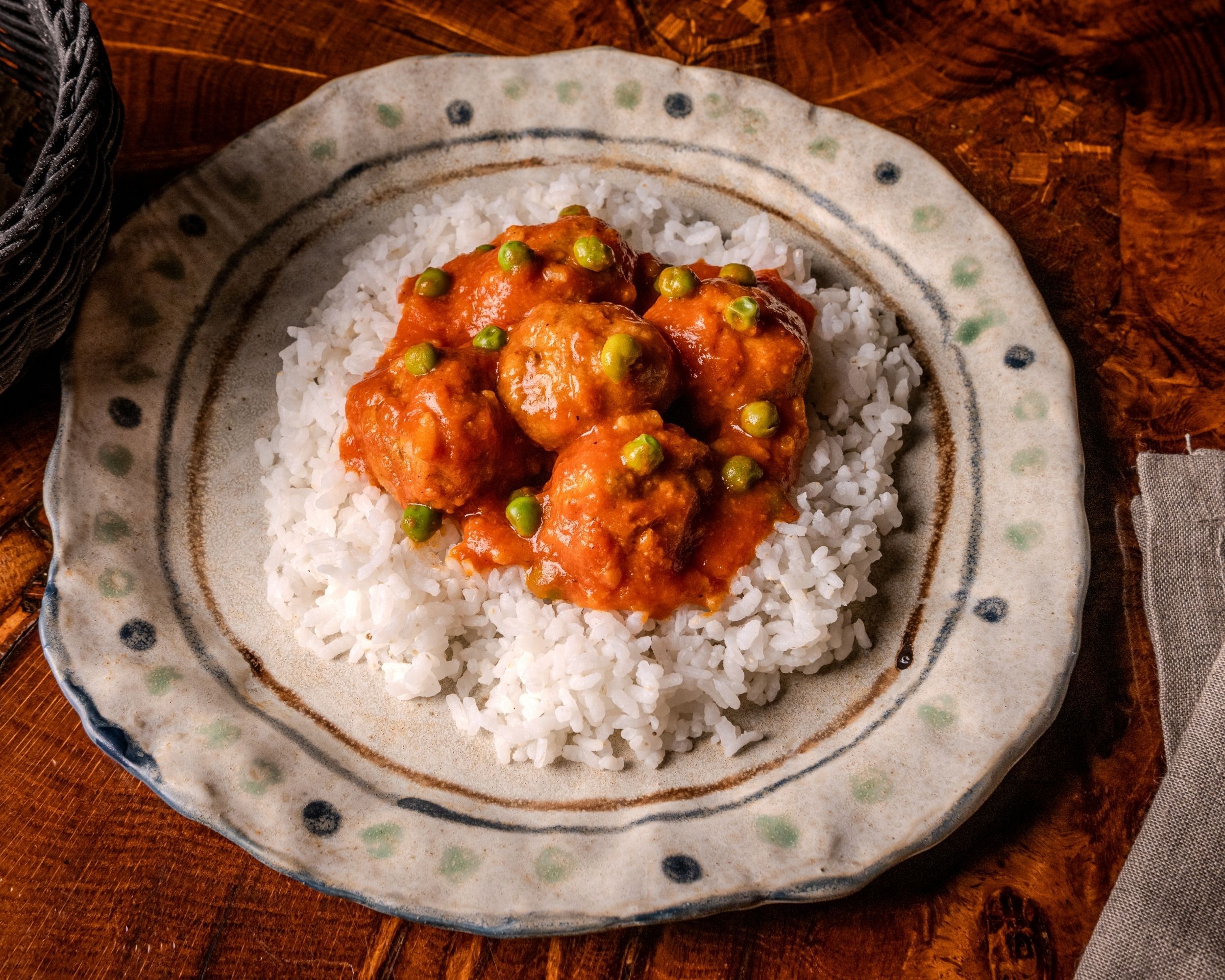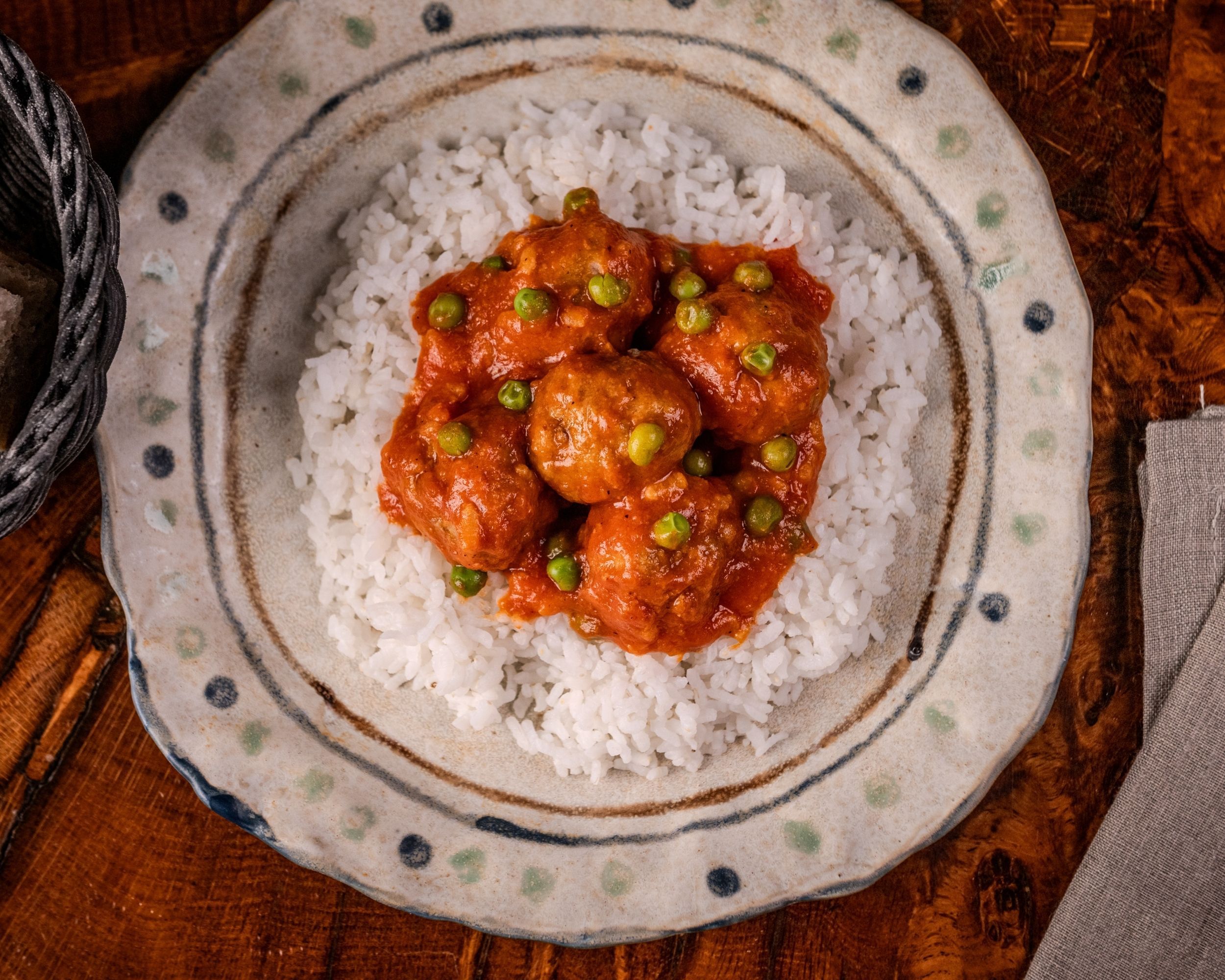 Preparadas con carne picada de cerdo y ternera, nuestras albóndigas se cocinan lentamente en tomate frito casero con guisantes y perejil. Servidas con arroz, son un plato completo y lleno de sabor tradicional.