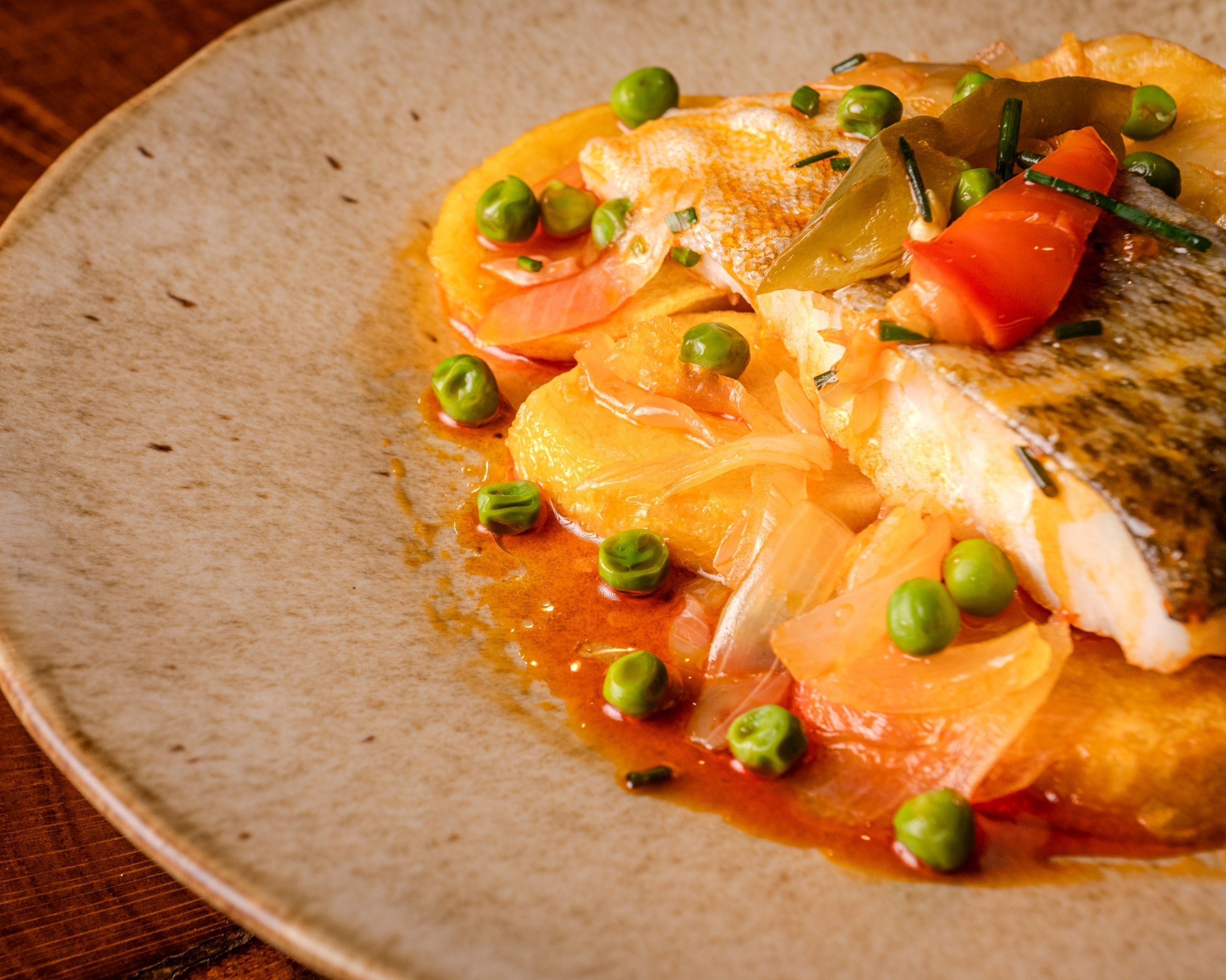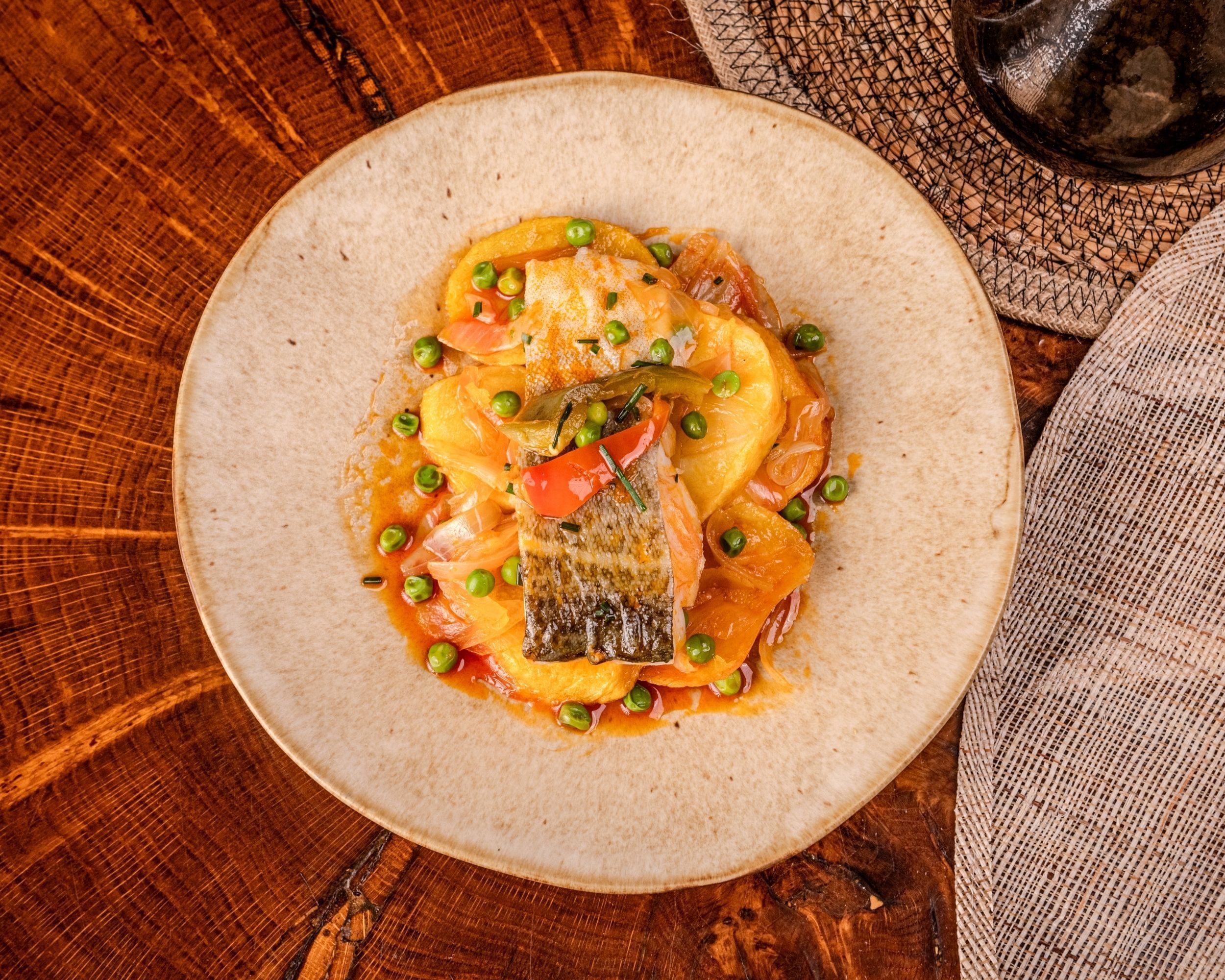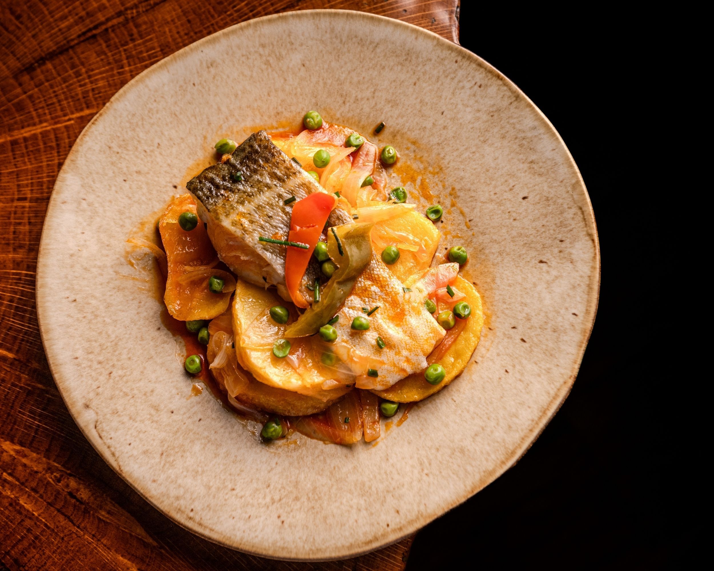 Lomos de bacalao cocinados suavemente sobre patata y cebolla, terminados con ajada de aceite de oliva, ajo y pimentón dulce. Toque de laurel y pimienta. Un plato casero, equilibrado y aromático que llena el estómago y contenta el alma.