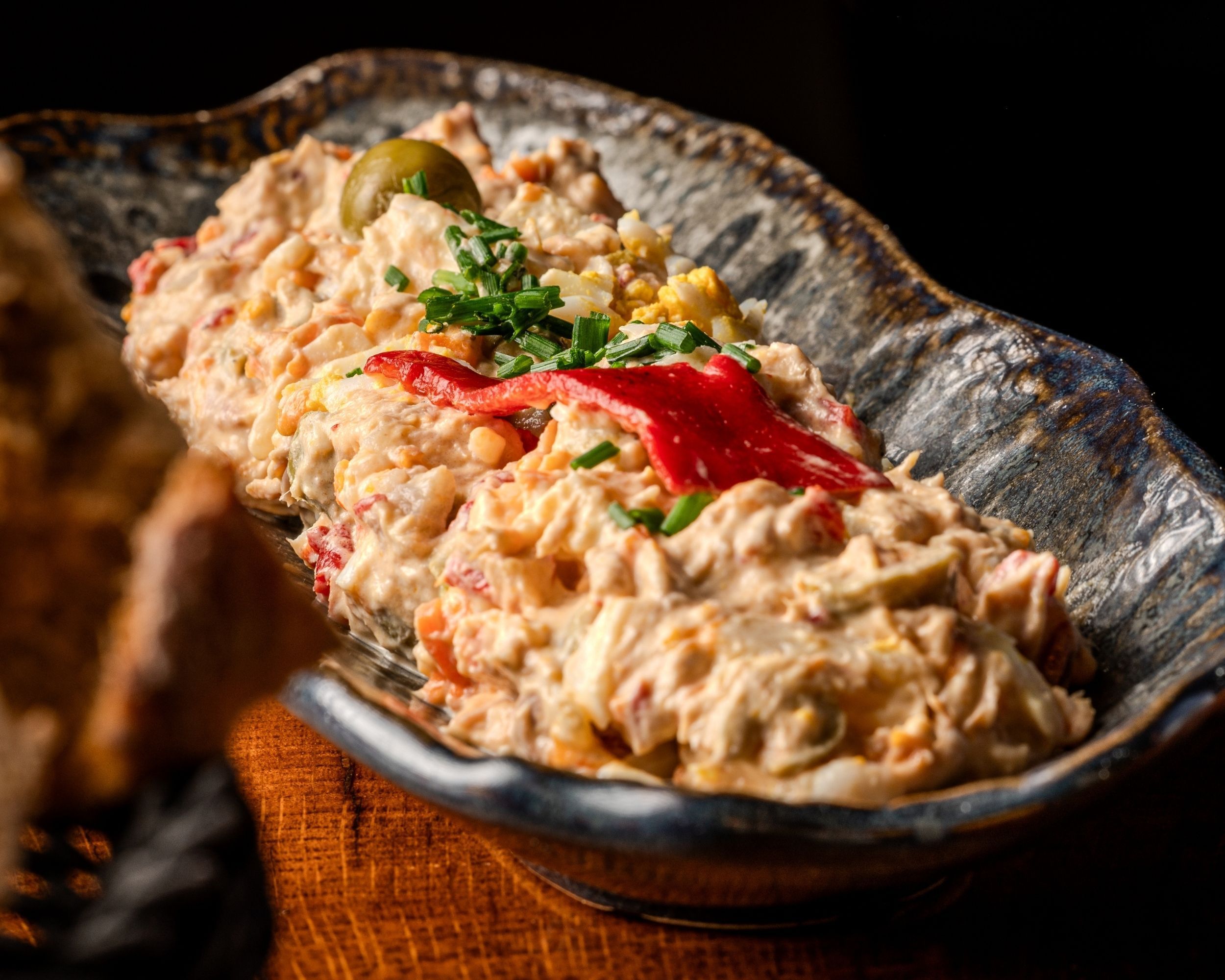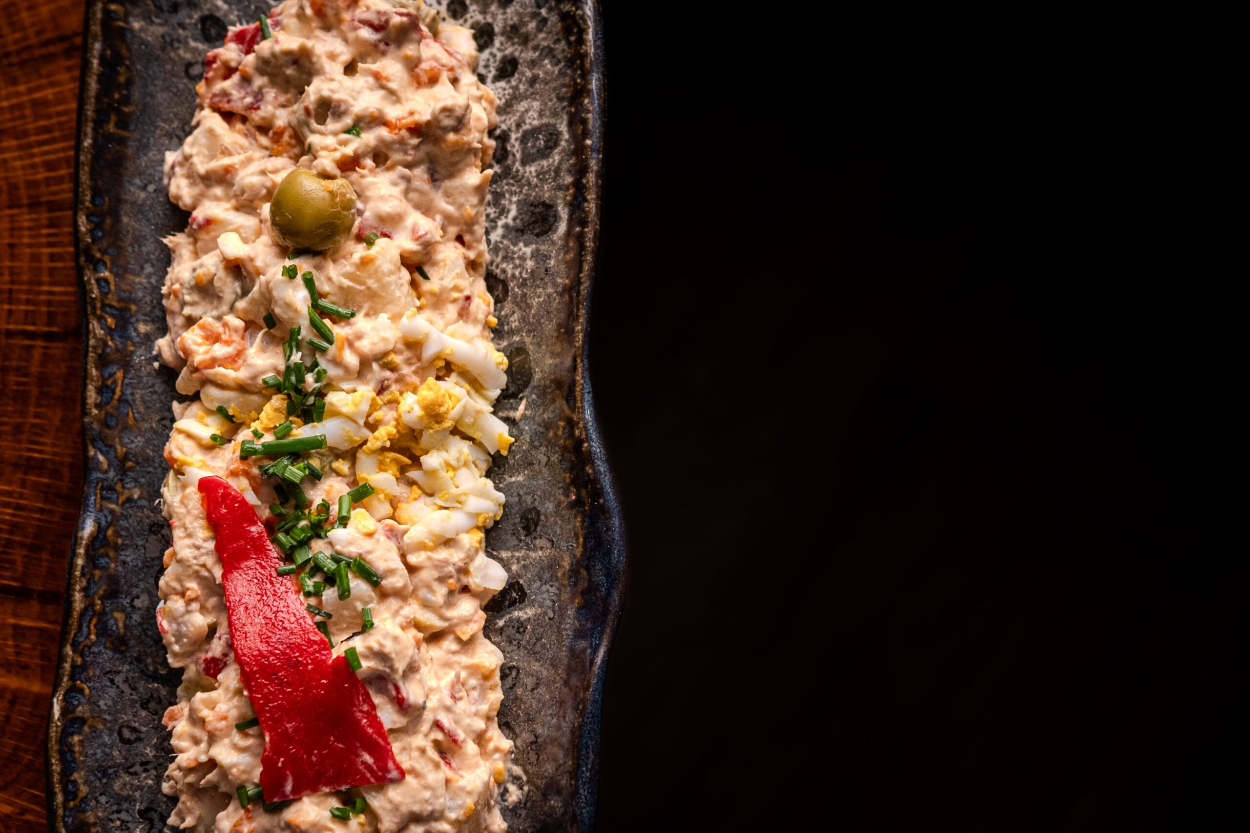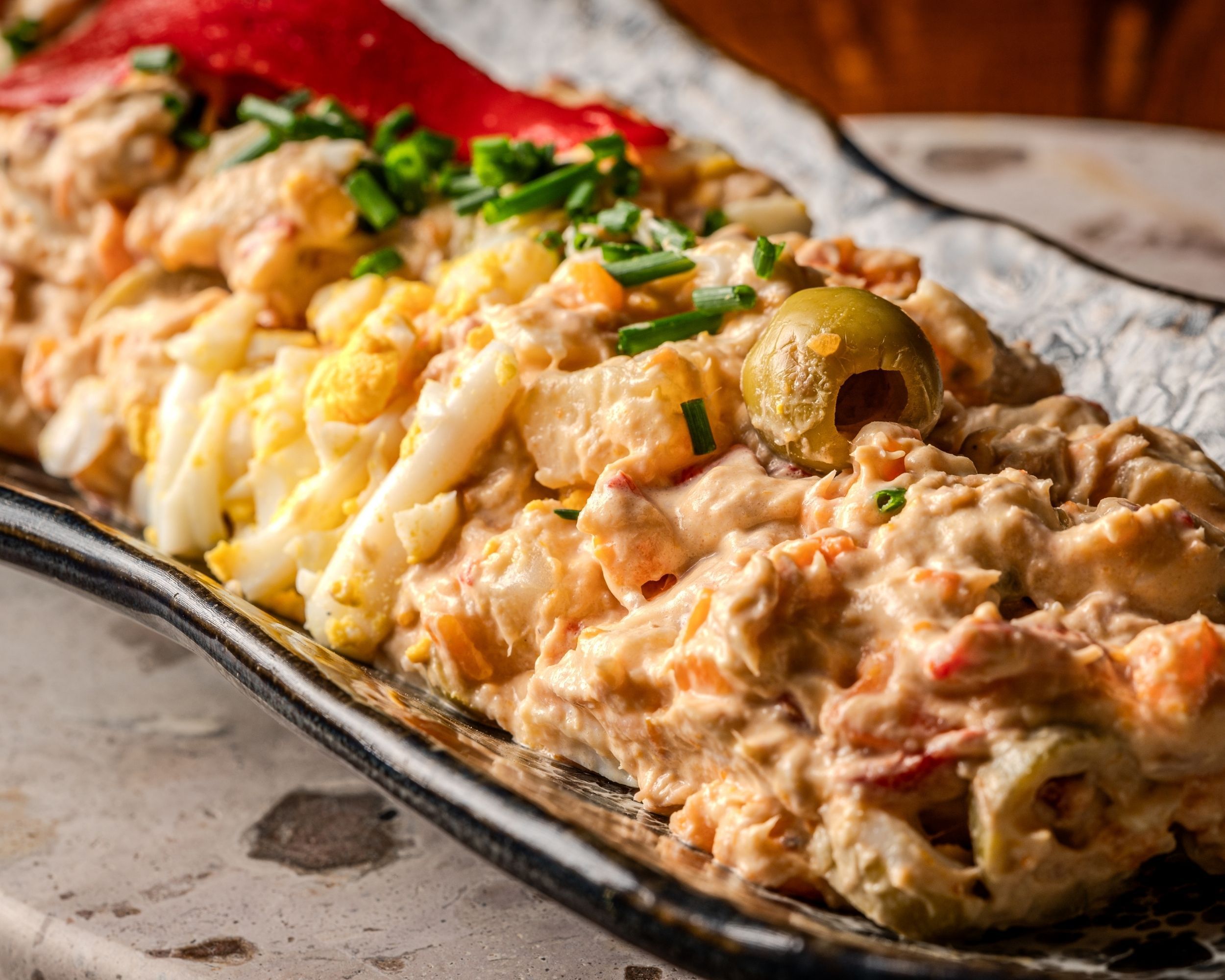 Elaborada con patatas tiernas, zanahorias, atún y mayonesa casera, nuestra ensaladilla A Cepa se completa con pimientos del piquillo, aceitunas y huevo duro. Un clásico hecho a mano, con el sabor auténtico de siempre.