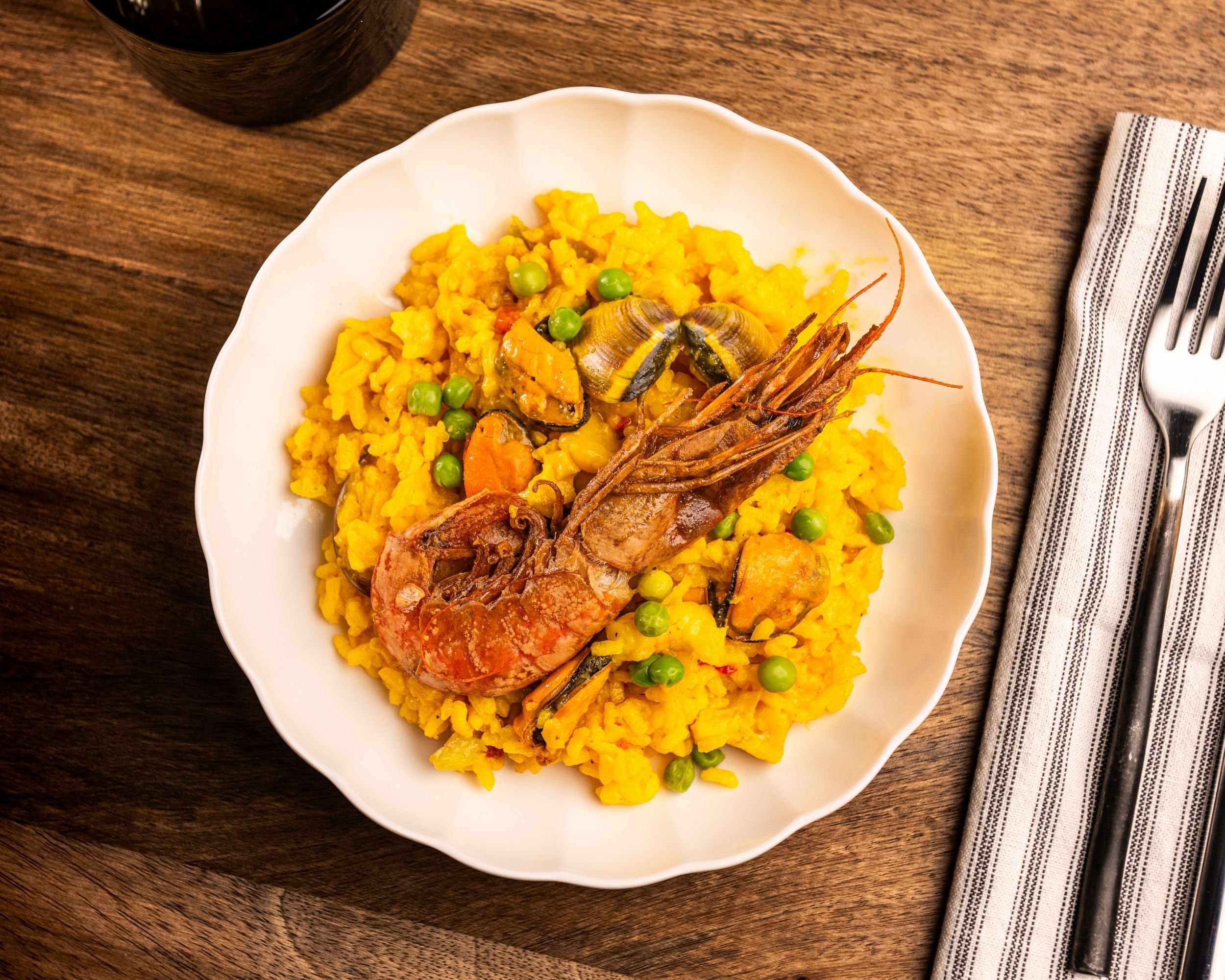 Arroz bomba cocido en caldo de pescado con merluza, almejas, mejillones y gambón. Sofrito de pimiento y cebolla, con un toque de vino blanco, laurel y perejil. Grano suelto, sabor profundo. Un pedazo del mar en tu mesa.